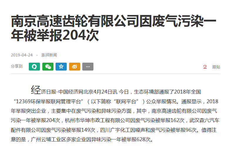 2019年,我司對南京高速齒輪有限公司的展開了環境檢測,該公司因廢氣和異味一年被舉報達數百次(下圖為新聞截圖)。